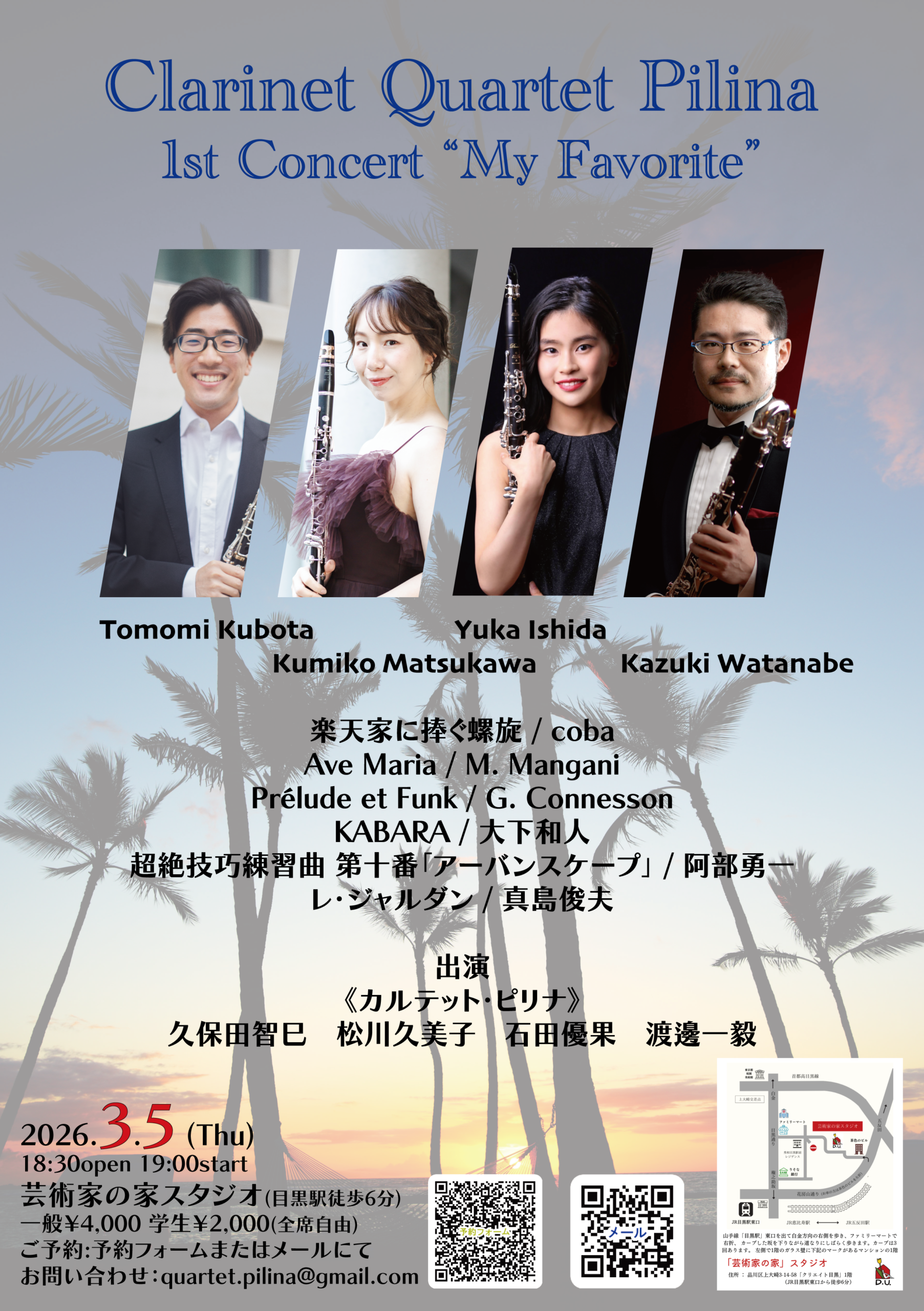 新たなクラリネット4重奏団、《カルテット・ピリナ》の旗揚げ公演です。